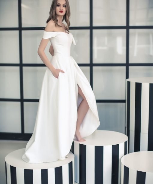 Ilga, pieno spalvos vestuvinė suknelė. Viršutinė dalis – korsetas, apnuoginantis pečius. Su rankovytėmis ir didelio kaspino dekoracija viename šone. Sijonas su patogiomis kišenėmis, šiek tiek paklostuotas.