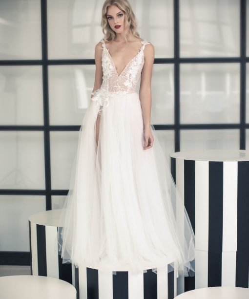 Ilga, vestuvinė suknelė, sudaryta iš dviejų dalių: viršutinė dalis kūno spalvos bodis, gausiai išsiuvinėtas pieno spalvos gipiūru. Pagrindinis gipiūras primena koralų raštą, o papildomai ant jo išsiuvinėtas dar vienas gipiūras primena gėlių šakų motyvą ir turi 3D efektą. Petnešos taip pat dekoruotos iškiliomis gėlėmis, nugara atvira. Iškirptės gylį priekyje ir nugaroje galima koreguoti. Sijonas pasiūtas iš kelių sluoksnių pieno spalvos tiulio, priekyje yra skeltukas, kuris gražiai atidengia jūsų kojas. Skeltuko gylį galima keisti, jei bijosite, kad suknelė atrodo per daug seksuali. Sijonas turi šleifą, kuris nuotraukose atrodys įspūdingai. Vakare po ceremonijos galima pakeisti šį įspūdingą sijoną į trumpą, su kuriuo galėsite šokti iki ryto.
