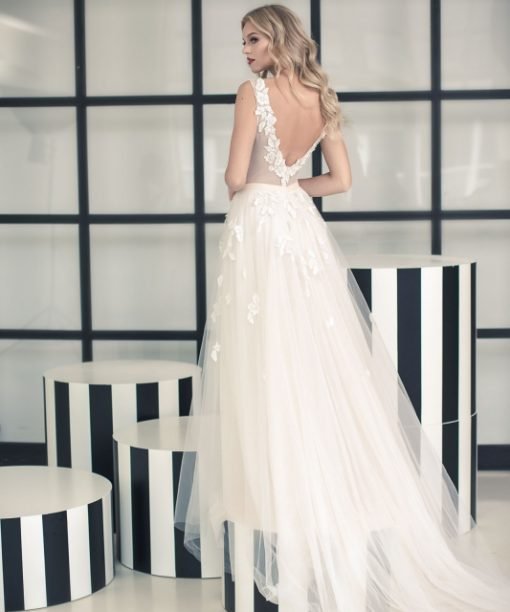 Ilga, vestuvinė suknelė, sudaryta iš dviejų dalių: viršutinė dalis – pieno spalvos bodis, lengvai permatomas, siuvinėtas pieno spalvos iškiliu, itališku gipiūru. Gipiūro žiedai ir lapai turi 3D efektą, gėlių viduriukai subtiliai siuvinėti karoliukais. Bodžio nugara labai atvira, todėl suknelė iš nugaros atrodo taip pat įspūdingai, kaip ir iš priekio. Sijonas pasiūtas iš kelių sluoksnių tiulio, viršutinis sluoksnis – pieno spalvos, labai lengvas, siuvinėtas tais pačiais motyvais, kaip ir bodis. Apatiniai sluoksniai – sunkesnis, pudros atspalvio tiulis, dėl kurio labiau išryškėja viršutinio tiulio siuvinėjimai ir lengvumas. Sijonas turi ilgą šleifą, kuris įspūdingai atrodys jūsų nuotraukose ir bažnyčioje. Vakare po ceremonijos galima pakeisti šį įspūdingą sijoną į trumpą, su kuriuo galėsite šokti iki ryto.