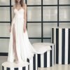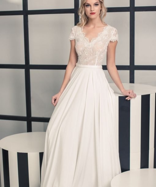 Klasikinio kirpimo suknelė su ilgu, šifoniniu sijonu. Viršutinė dalis iš itališko gipiūro, V formos iškirpte, subtiliai dekoruota karoliukais. Yra mažytės rankovės – sparneliai. Sijono priekyje – ilgas praskiepas, kuris matosi tik einant. Ši suknelė ypač fotogeniška, nes lengvas šifonas gražiai pakyla nuo vėjo. Nugara dekoruota perlinėmis sagutėmis, iškirpte iki liemenėlės.