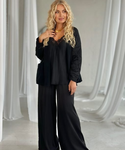 Prailginto modelio viskozinio šilko kelnės, storesnės malonios medžiagos, per juosmenį turi gumelę ir šonuose esančias kišenes. Tinka ypatingai progai, kasdieniam įvaizdžiui ar atostogoms.
