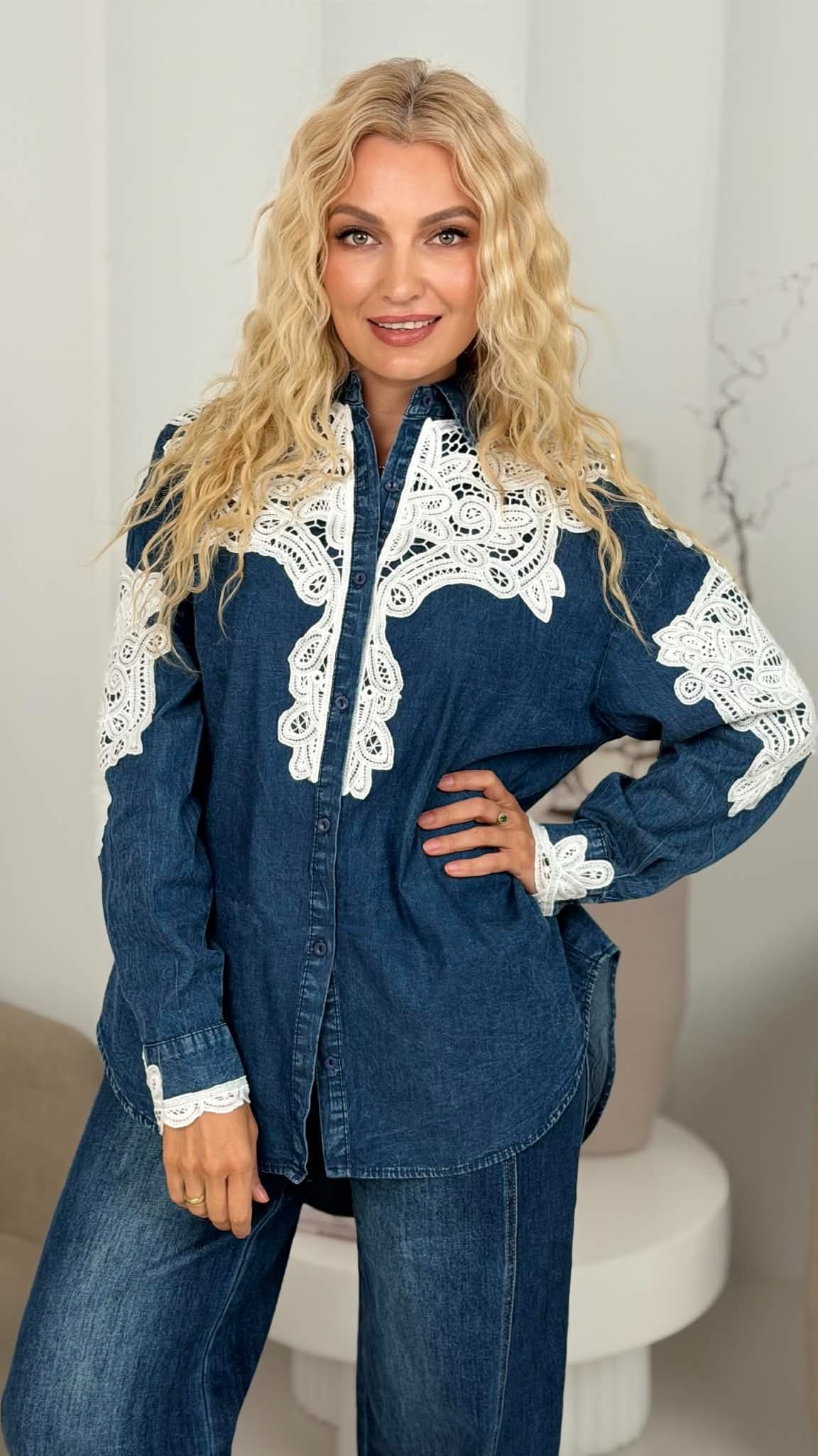 Marškiniai "Nėrinių aplikacijos", tamsi džinso spalva