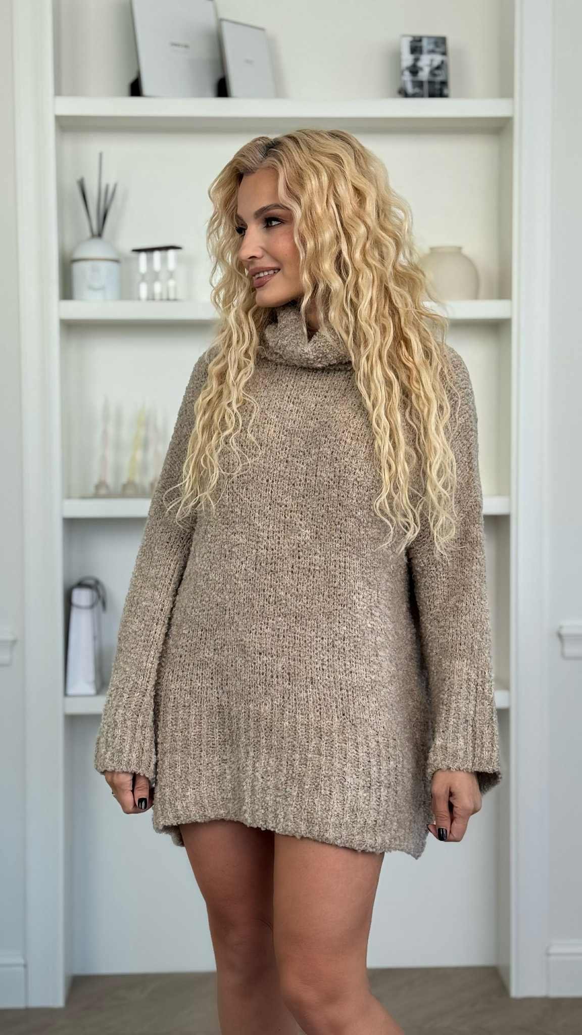 Minkštas ir jaukus megztinis, kuris taps tavo mėgstamiausiu šaltojo sezono palydovu. Pagamintas iš švelnaus, storo audinio, užtikrinančio šilumą ir komfortą. Laisvas siluetas ir platūs rankogaliai suteikia modernumo bei leidžia laisvai judėti. Megztinis turi stambų, patogų golfo tipo kaklą, kuris apsaugo nuo vėjo ir suteikia jaukumo pojūtį. Puikiai dera su klasikinėmis kelnėmis, džinsais ar sijonu – universalus pasirinkimas tiek kasdienai, tiek jaukiam poilsiui namuose.