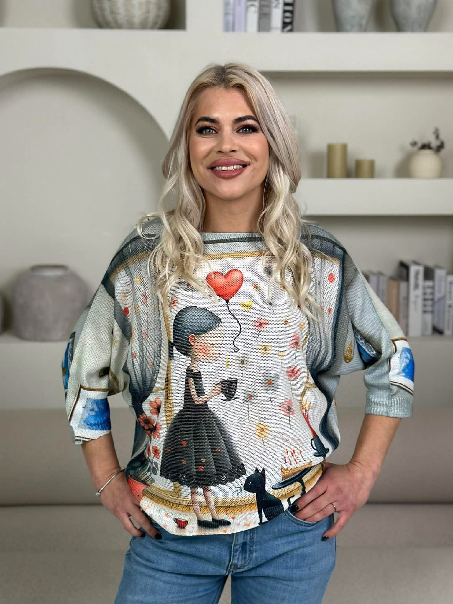 Šis megztukas pasižymi originaliu, menišku dizainu ir patogiu siluetu. Lengvas, laisvo kritimo modelis suteikia judėjimo laisvę ir elegantišką, neįpareigojantį įvaizdį. Megztukas turi platų, šiek tiek nuleistų pečių kirpimą bei apvalią iškirptę, pabrėžiančią kaklo liniją. Puikiai dera tiek su klasikinėmis kelnėmis, tiek su džinsais ar sijonu – idealiai tinka kasdienai ar laisvalaikiui, kai norisi išskirtinumo ir komforto viename.