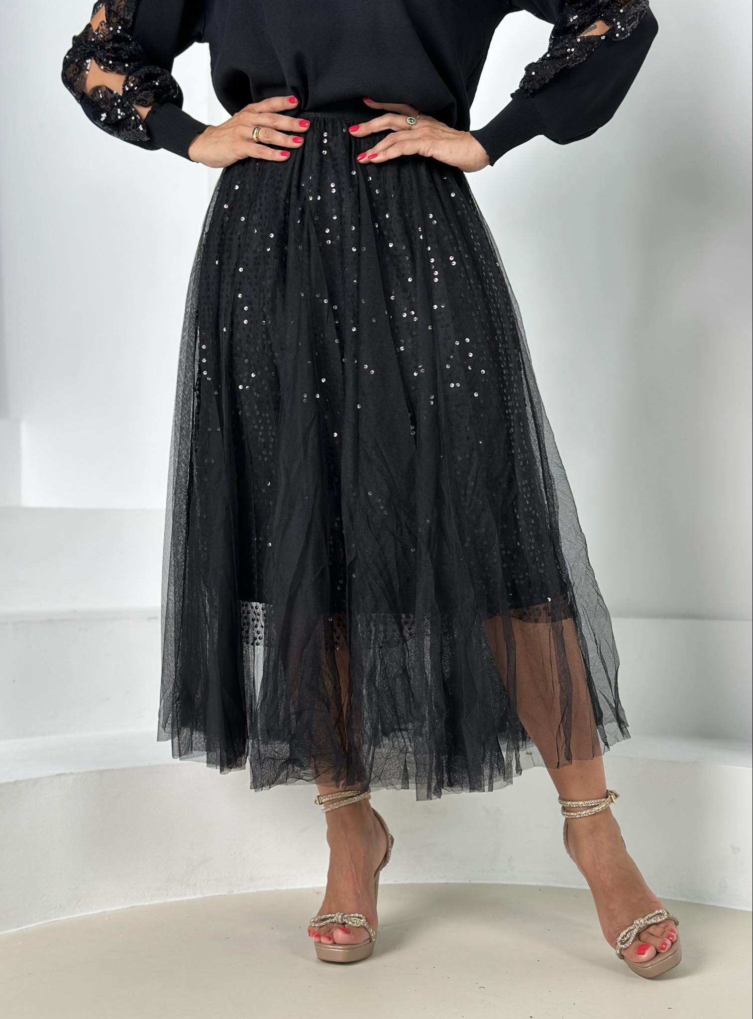 Juodos spalvos sijonas su tiuliu ir žėrinčiais blizgučiais. Liemuo su gumele, todėl puikiai prisitaikys, tiulis nepučia klubų, todėl yra gražus ir tolygus kritimas.
