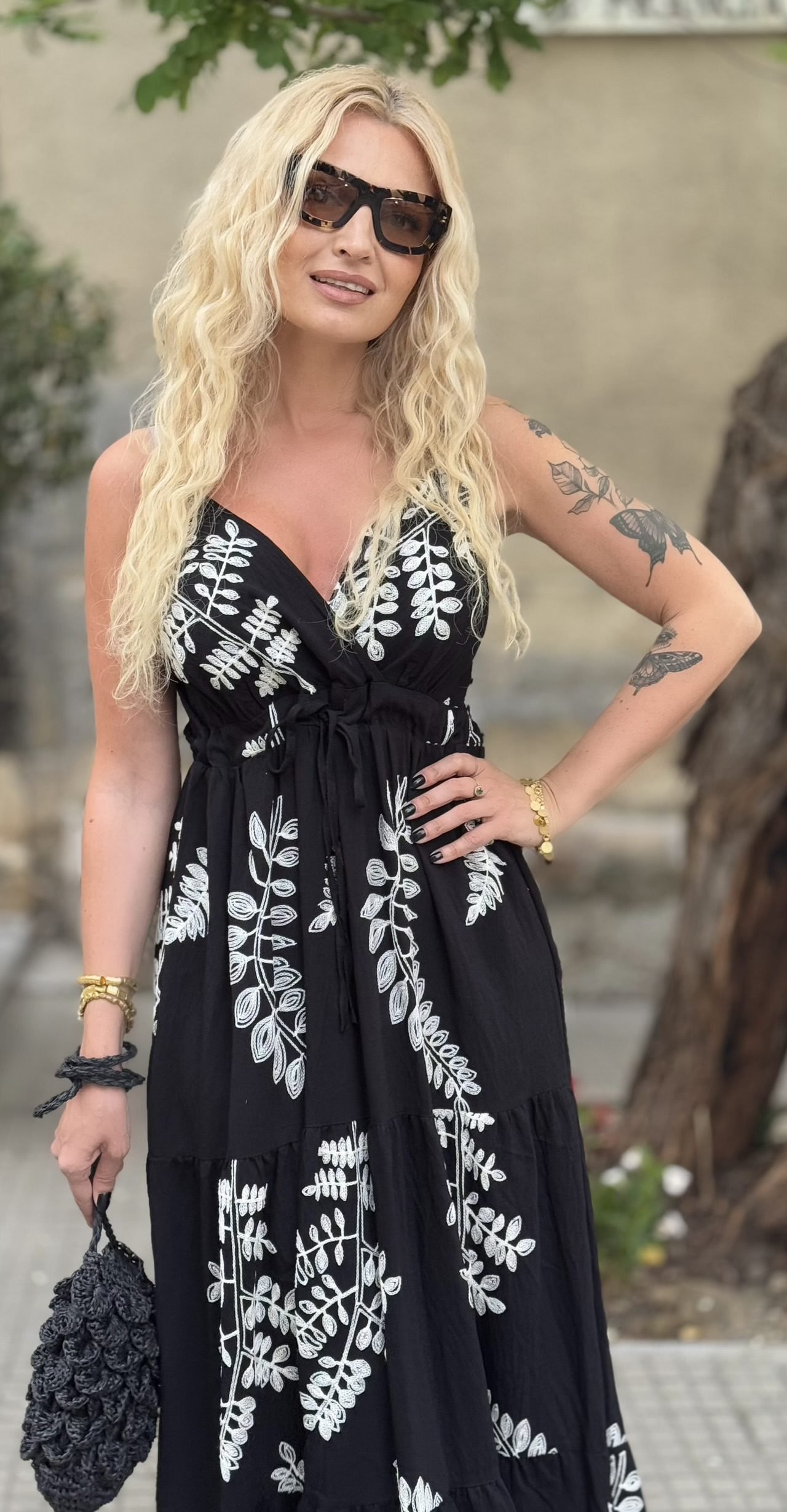 Ilga suknelė ant petnešėlių su subtilia iškirpte, per liemenį susiriša raišteliu ir gražiai jį pabrėžia. Puikus pasirinkimas lengvam, vasariškam įvaizdžiui.