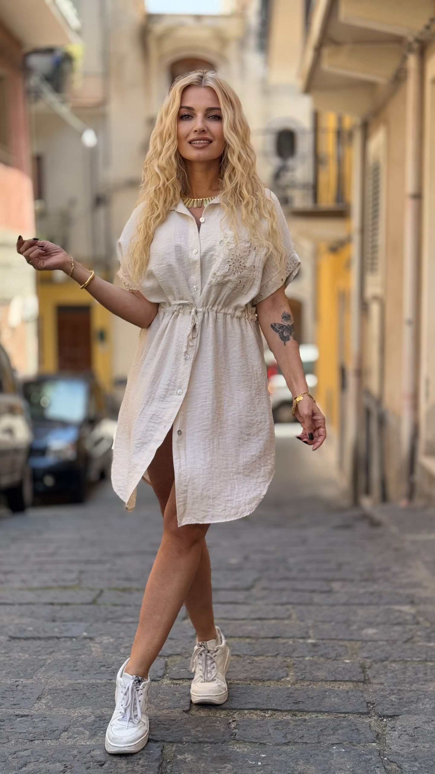 Marškinių tipo suknelė su sagutėmis, raišteliais ties juosmeniu ir elegantiškomis ažūrinėmis detalėmis – lengva ir stilinga kasdienai.