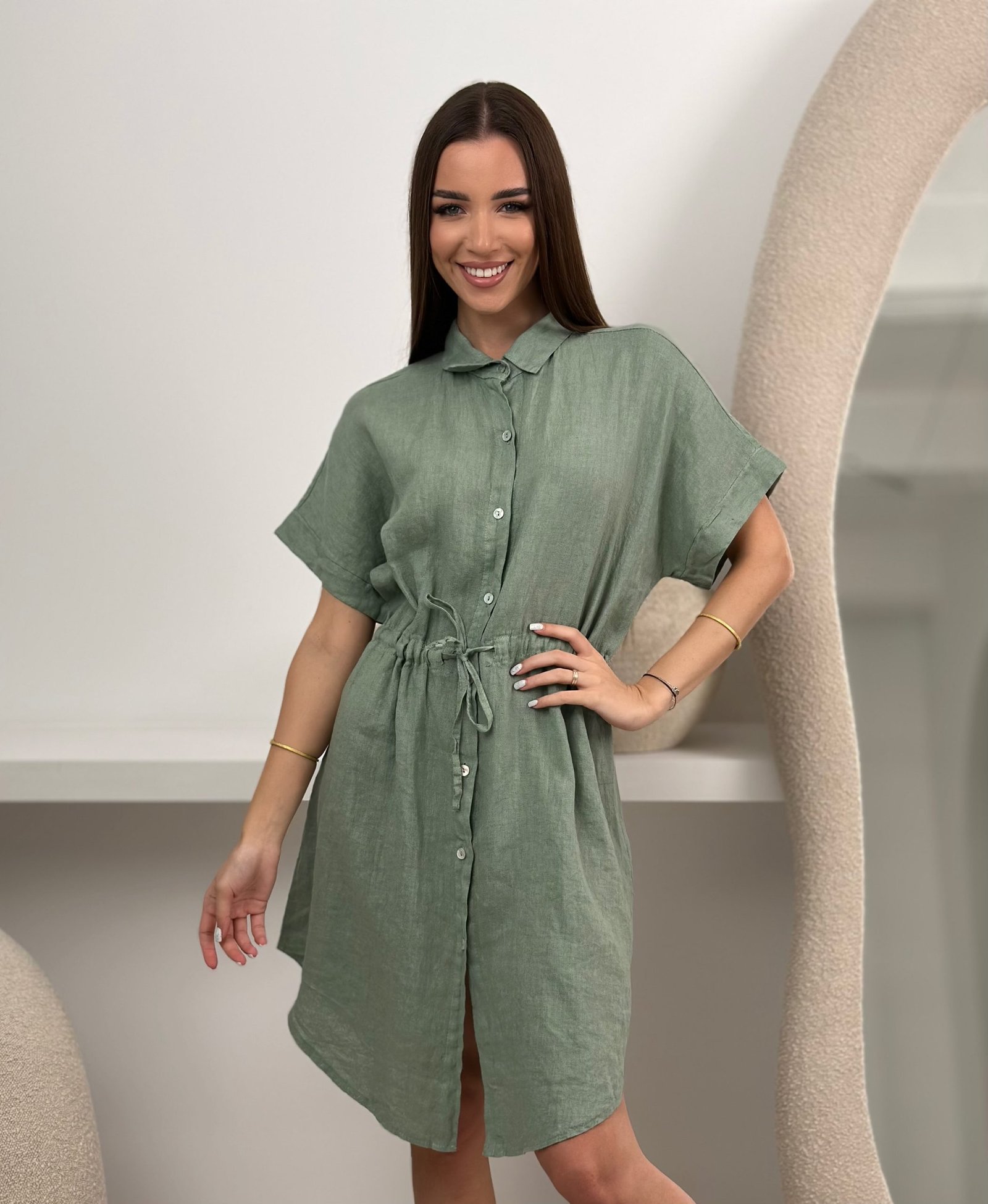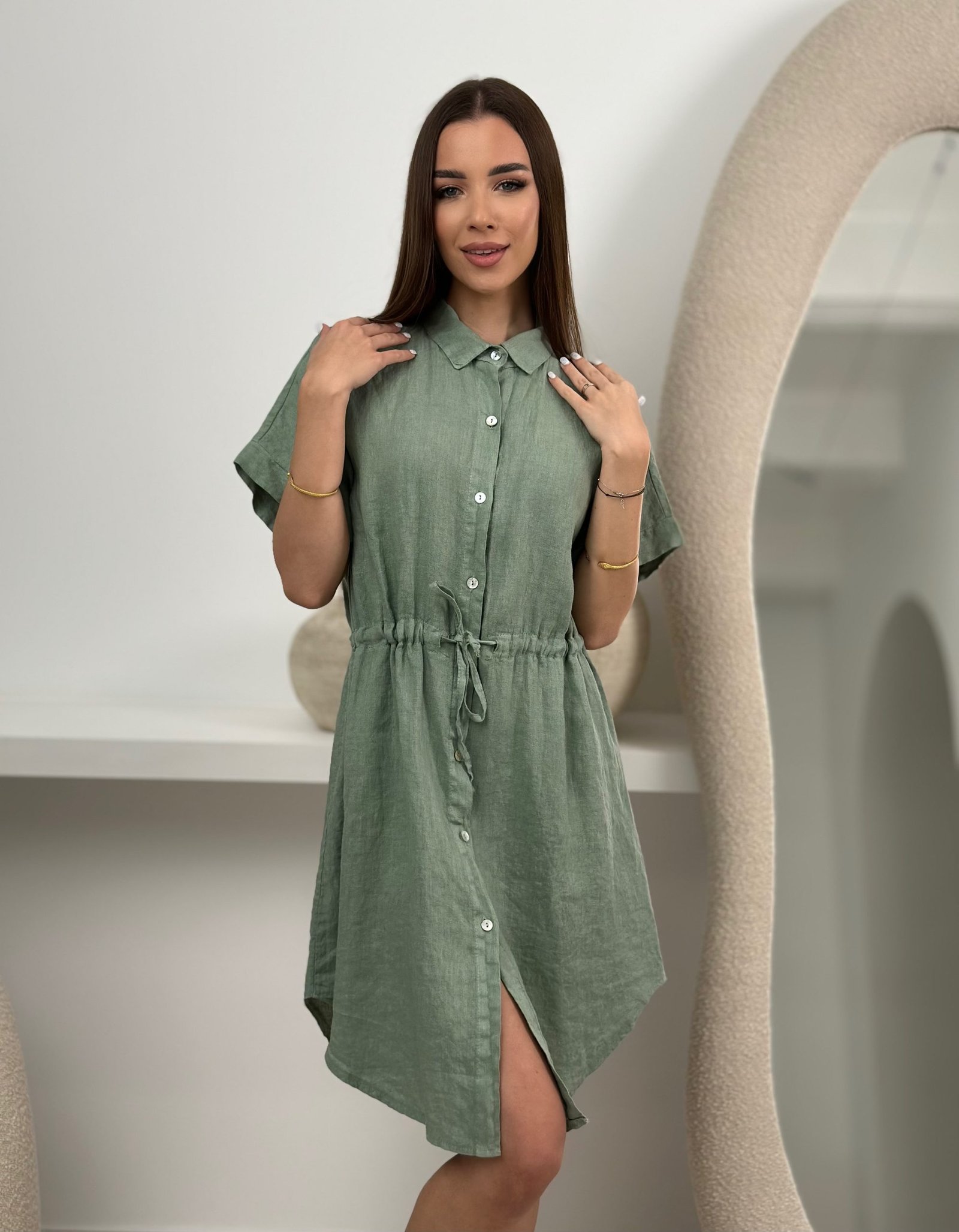 Lininė marškinių tipo suknelė su sagutėmis ir reguliuojamu raišteliu ties liemeniu – patogiam ir stilingam įvaizdžiui.