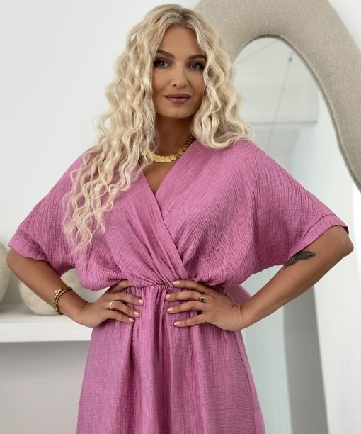 Itin lengvo audinio suknelė su minimalistine iškirpte per krūtinę, guma ties juosmeniu ir skeltuku šone. Laisvo silueto – patogu ir stilinga kiekvieną dieną.