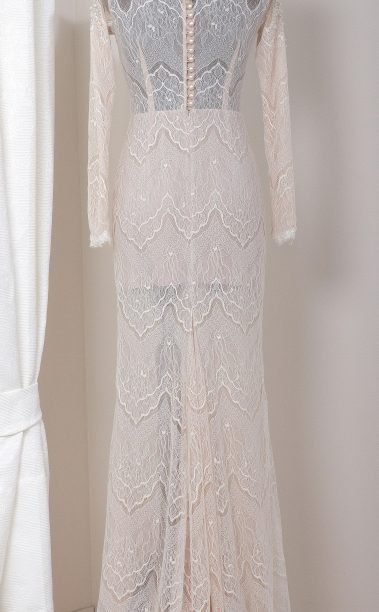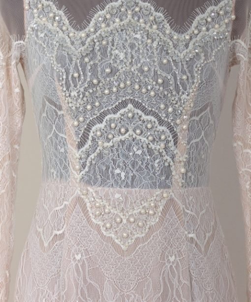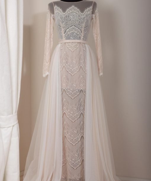 Ilga neriniuota suknelė dviejų dalių. Viršus siuvinėtas tikrais perlais ir Swarovskio kristalais. Ant viršaus uždedamas tiulinis sijonas.