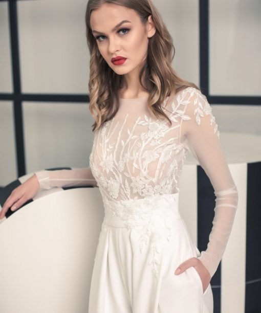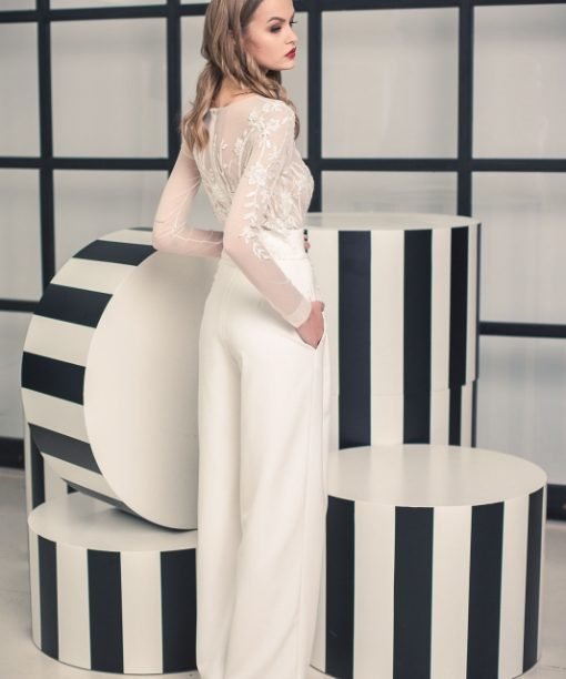 Pieno spalvos kombinezonas nestandartinei nuotakai. Viršutinė dalis – pieno spalvos tinklas, siuvinėtas pieno spalvos gipiūro aplikacijomis. Apačia – iš krentančio sunkiomis klostėmis viskozinio audinio. Platus diržas gražiai išryškina liemenį. Kelnių šonuose yra kišenės. Vestuvinė suknelė nebūtinai turi būti su sijonu. Drabužis turi atspindėti jūsų individualumą, o ne senus įsitikinimus, ar kitų žmonių lūkesčius. Išlik savimi svarbiausią dieną!