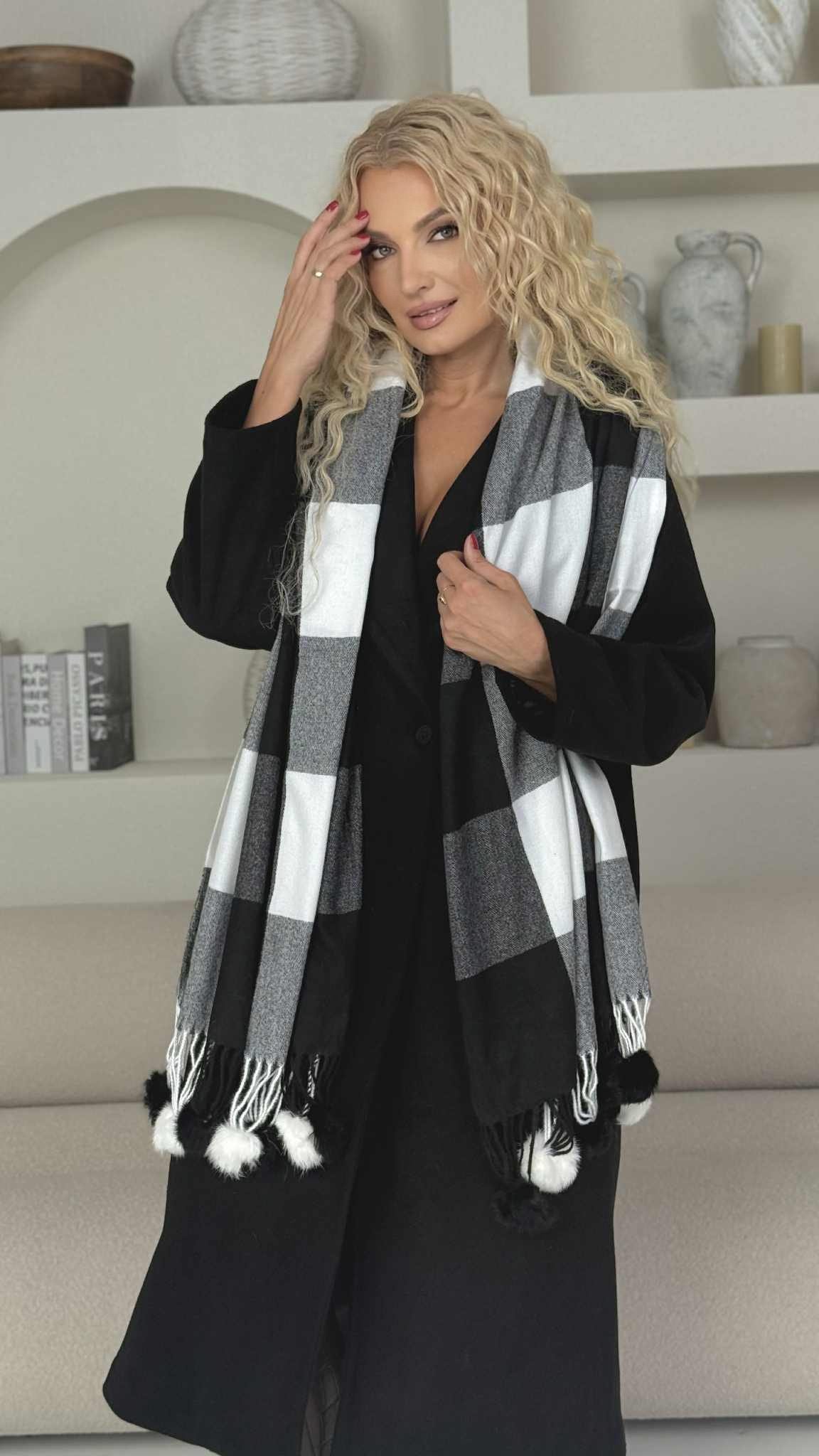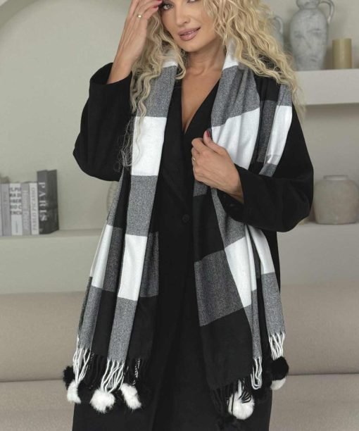 Šalikas „Languotas su kailio burbuliukais” juoda/balta spalva