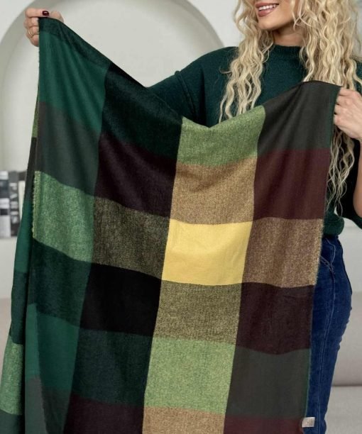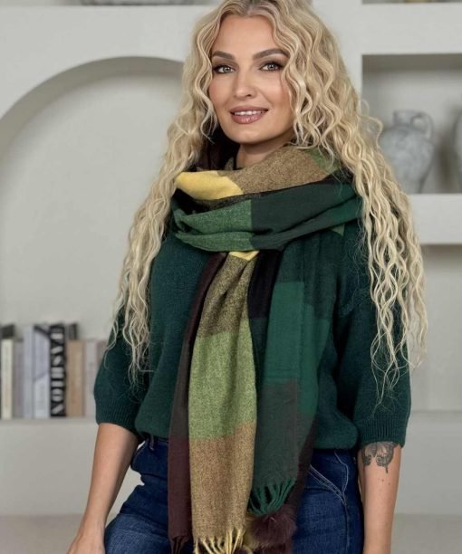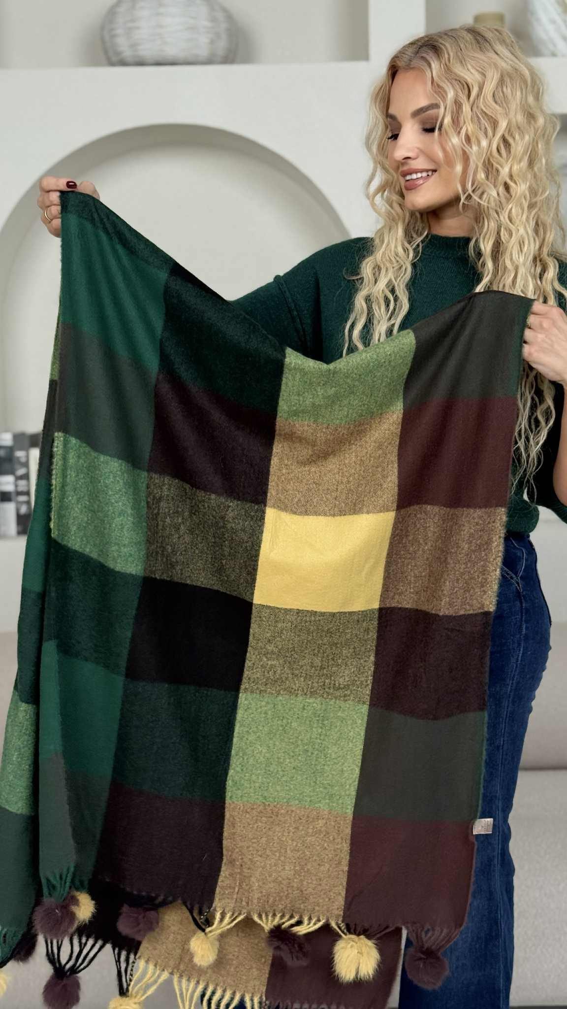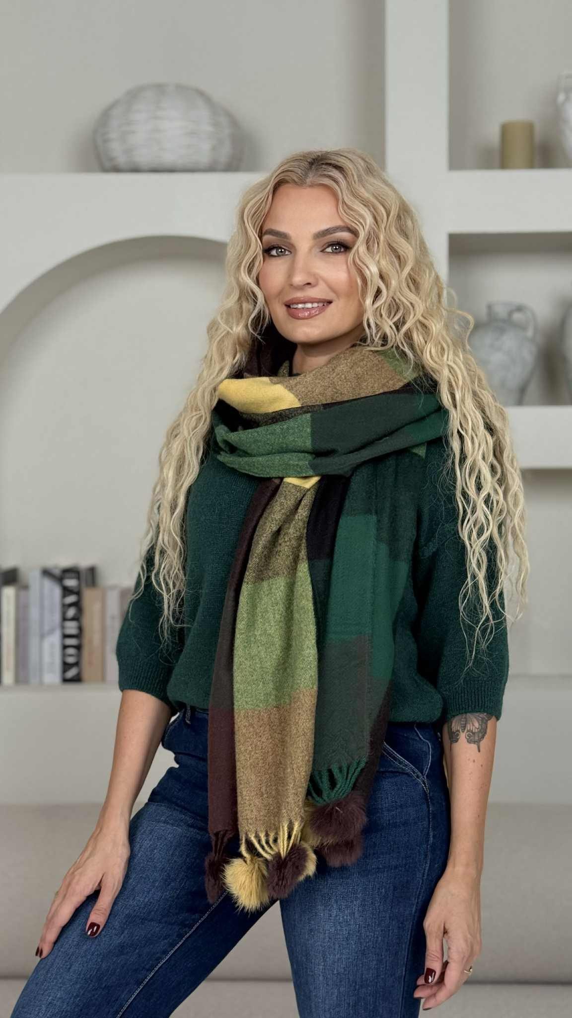 Šalikas „Languotas su kailio burbuliukais” žalia/geltona/ruda spalvos