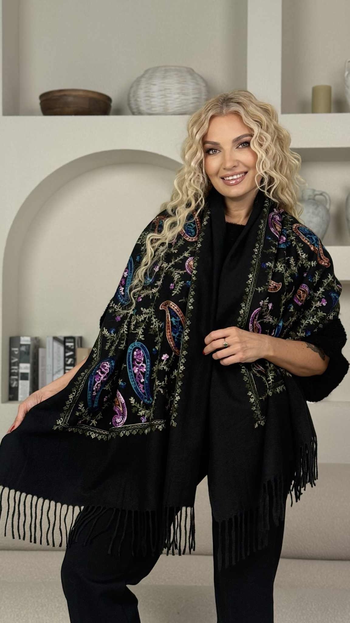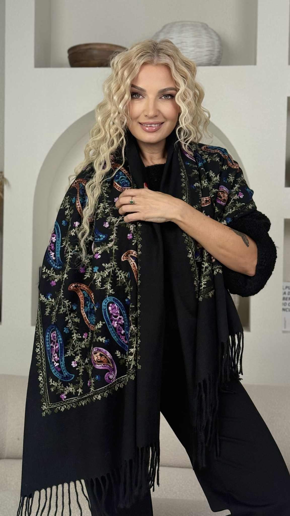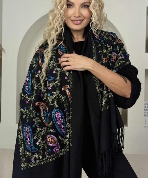 Šalikas „Siuvinėti ornamentai” , chaki/mėlyna/violetinė spalva