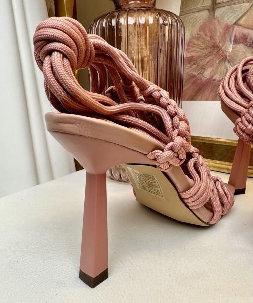 Koralinės spalvos aukštakulniai su pynėmis.
