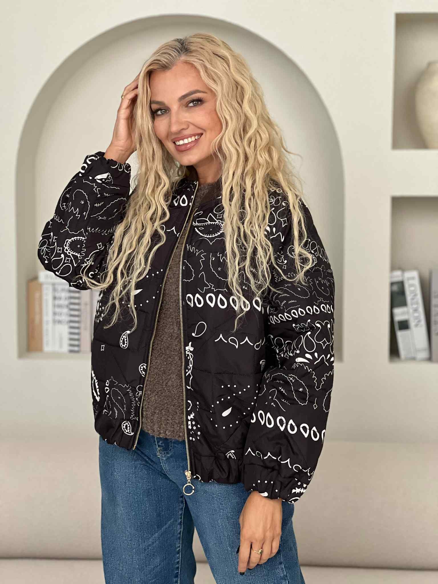 Išsiskirkite stilingu ir patogiu bomberiu, kuris taps nepakeičiama jūsų garderobo dalimi. Juodos spalvos audinys dekoruotas išraiškingais šviesiais raštais suteikia išskirtinumo ir urbanistinio žavesio. Šis bomberis puikiai dera tiek prie džinsų, tiek prie suknelės ar sportinės aprangos. Tai universalus pasirinkimas, kuris leis atrodyti stilingai bet kokiu oru.