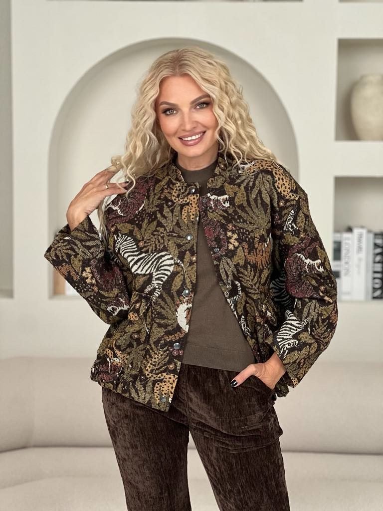 Išsiskirkite stilingu ir patogiu bomberiu, kuris taps nepakeičiama jūsų garderobo dalimi. Audinys dekoruotas išraiškingais zebrų ir augmenijos raštais suteikia išskirtinumo ir urbanistinio žavesio. Šis bomberis puikiai dera tiek prie džinsų, tiek prie suknelės ar sportinės aprangos. Tai universalus pasirinkimas, kuris leis atrodyti stilingai bet kokiu oru.