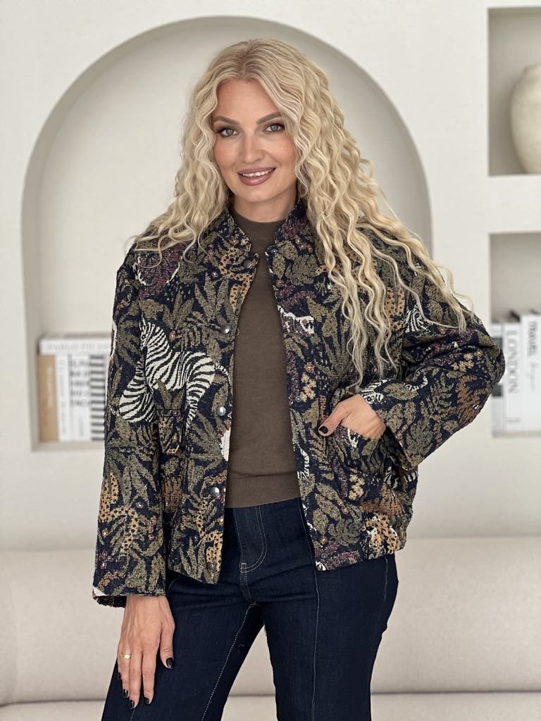 Išsiskirkite stilingu ir patogiu bomberiu, kuris taps nepakeičiama jūsų garderobo dalimi. Audinys dekoruotas išraiškingais zebrų ir augmenijos raštais suteikia išskirtinumo ir urbanistinio žavesio. Šis bomberis puikiai dera tiek prie džinsų, tiek prie suknelės ar sportinės aprangos. Tai universalus pasirinkimas, kuris leis atrodyti stilingai bet kokiu oru.