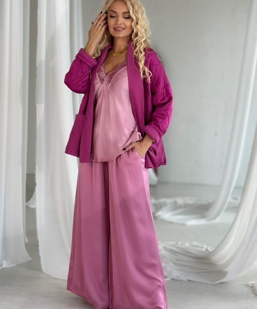 Prailginto modelio viskozinio šilko kelnės, storesnės malonios medžiagos, per juosmenį turi gumelę ir šonuose esančias kišenes. Tinka ypatingai progai, kasdieniam įvaizdžiui ar atostogoms.
