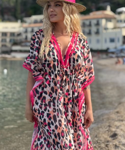 Lengvo audinio paplūdimio tunika su raišteliu per juosmenį, dekoruota leopardo raštu. Stilingas ir išskirtinis pasirinkimas vasaros akimirkoms.