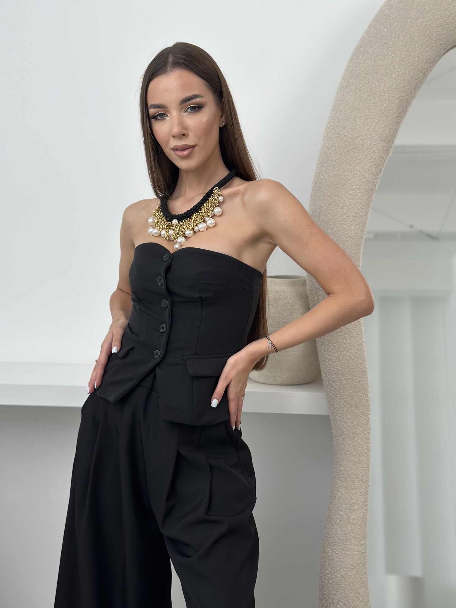 Juodos spalvos kostiuminio audinio elegatiškas korsetas.