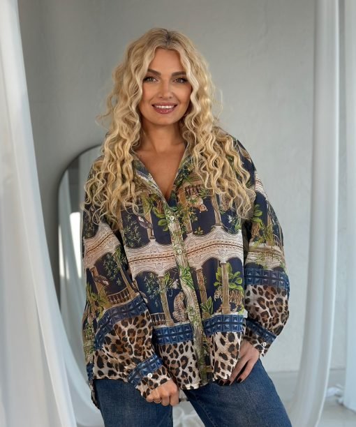 Lengvo ir elegantiško dizaino palaidinė su išskirtiniu kraštovaizdžio raštu. Laisvas kirpimas ir lengvas audinys – stilingam ir patogiam įvaizdžiui.