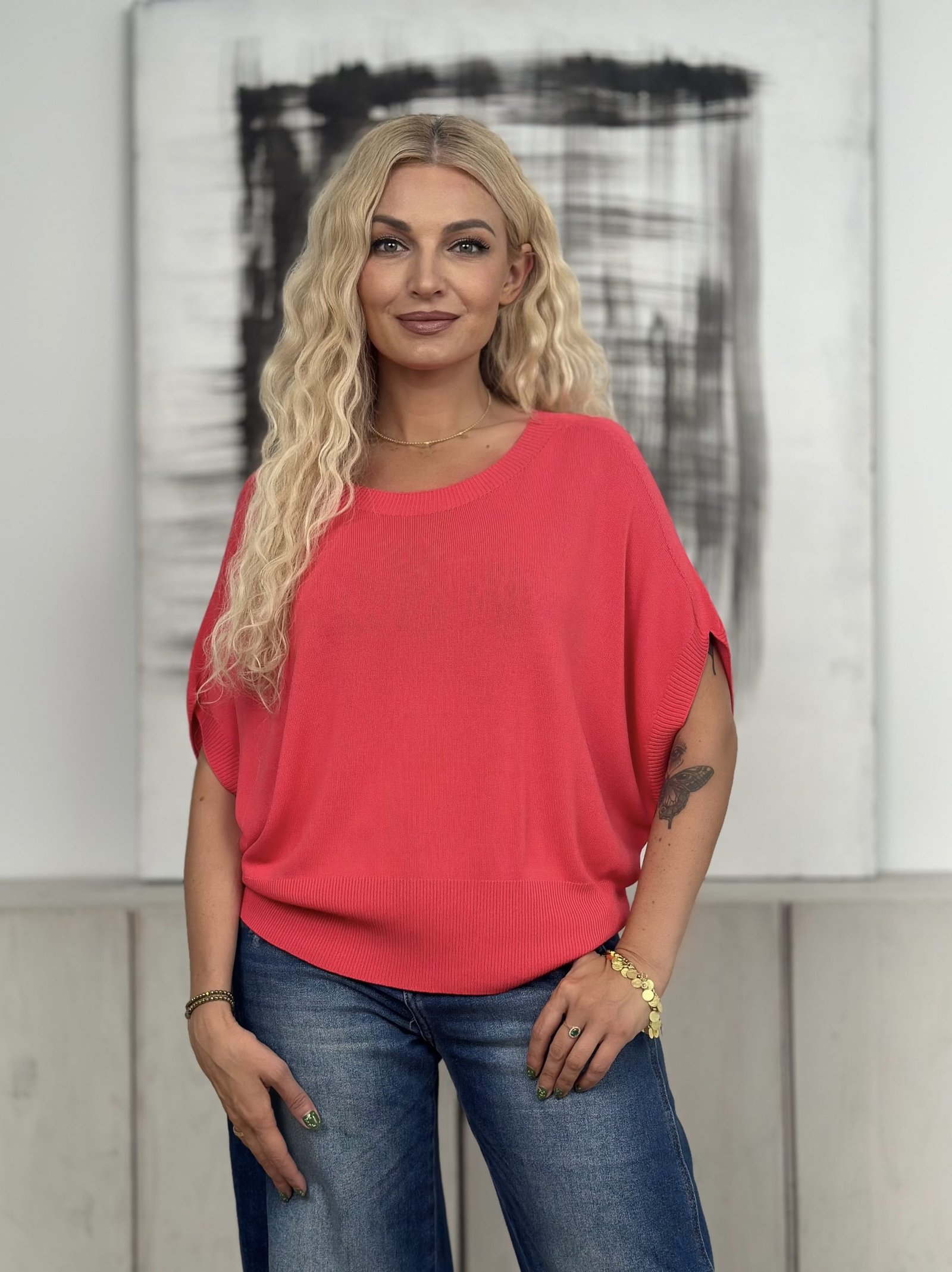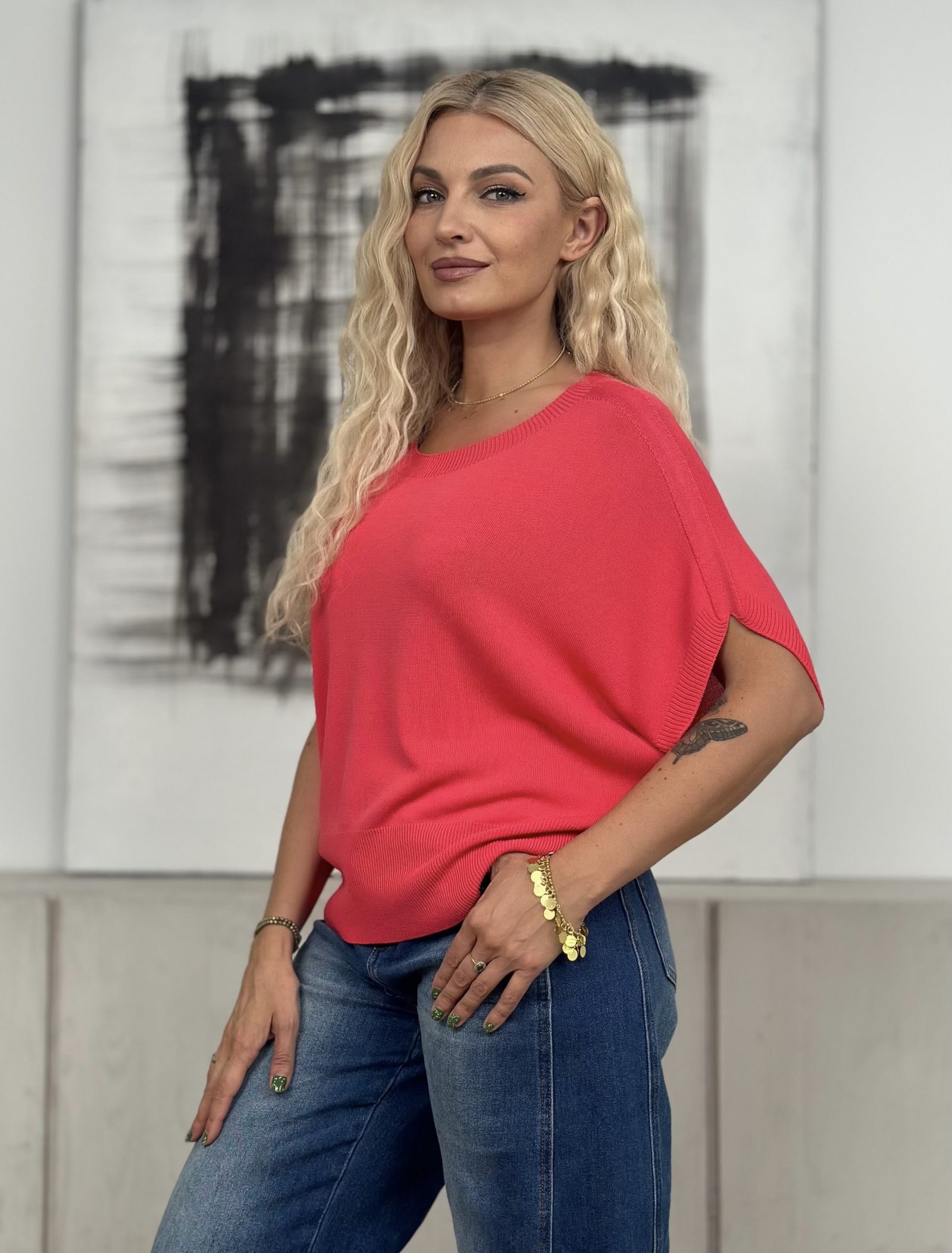 Laisvo silueto megzta palaidinė su kimono tipo rankovėmis – patogi, stilinga ir nevaržanti judesių. Puikiai tinka kasdienai.