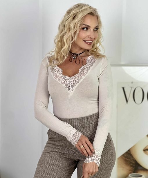 Palaidinė ilgomis rankovėmis išsiskiria gilesne V formos iškirpte, dekoruota subtiliais nėriniais. Prigludęs siluetas paryškina figūrą, o tampri medžiaga užtikrina komfortą visos dienos metu.
