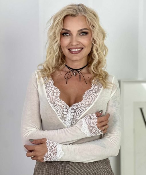 Palaidinė ilgomis rankovėmis išsiskiria gilesne V formos iškirpte, dekoruota subtiliais nėriniais. Prigludęs siluetas paryškina figūrą, o tampri medžiaga užtikrina komfortą visos dienos metu.