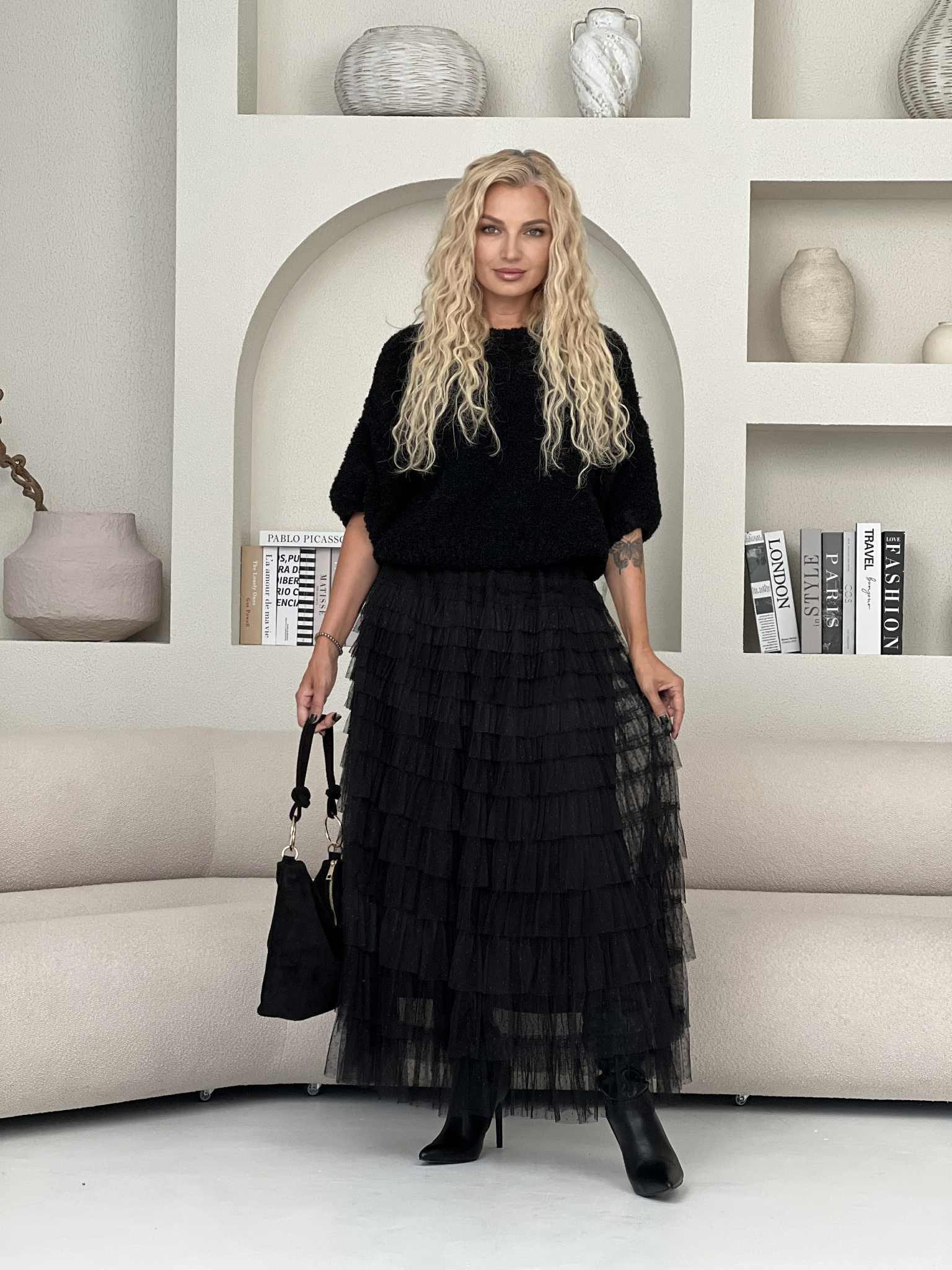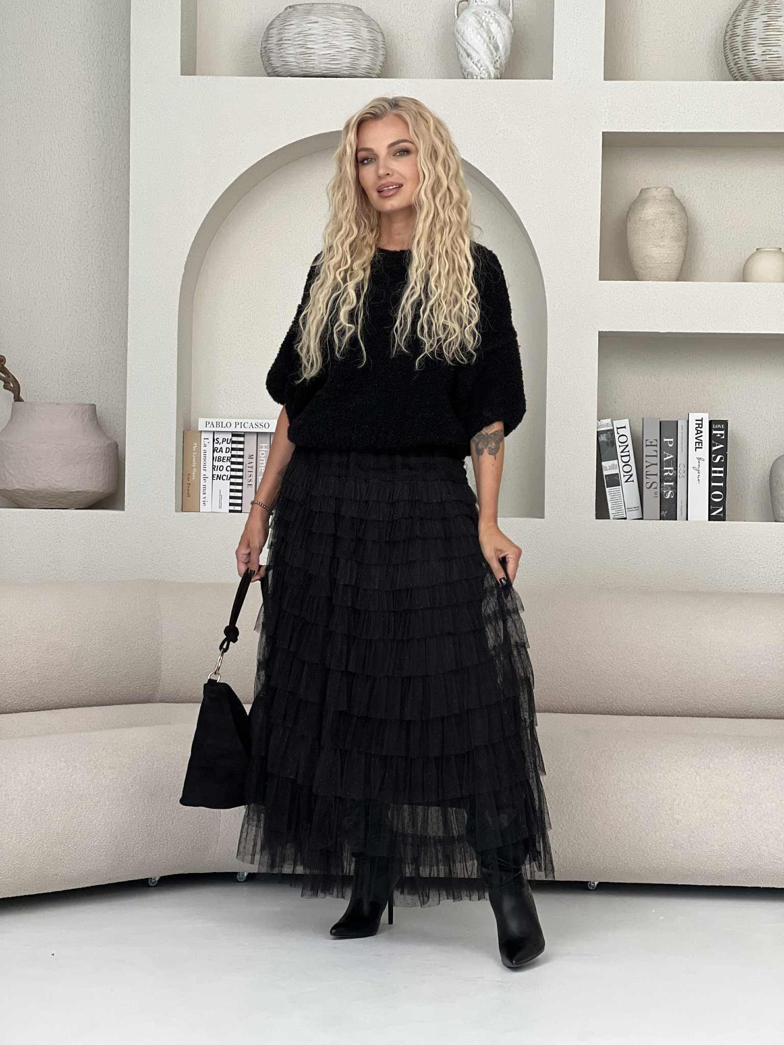 Sijonas lengvai krinta, o sluoksniuotas siluetas kuria išraiškingą įvaizdį. Tai universalus drabužis, kuris vienu metu gali būti ir elegantiškas, ir paslaptingai romantiškas – puikiai tiks tiek vakariniam įvaizdžiui, tiek stilingai kasdienybei