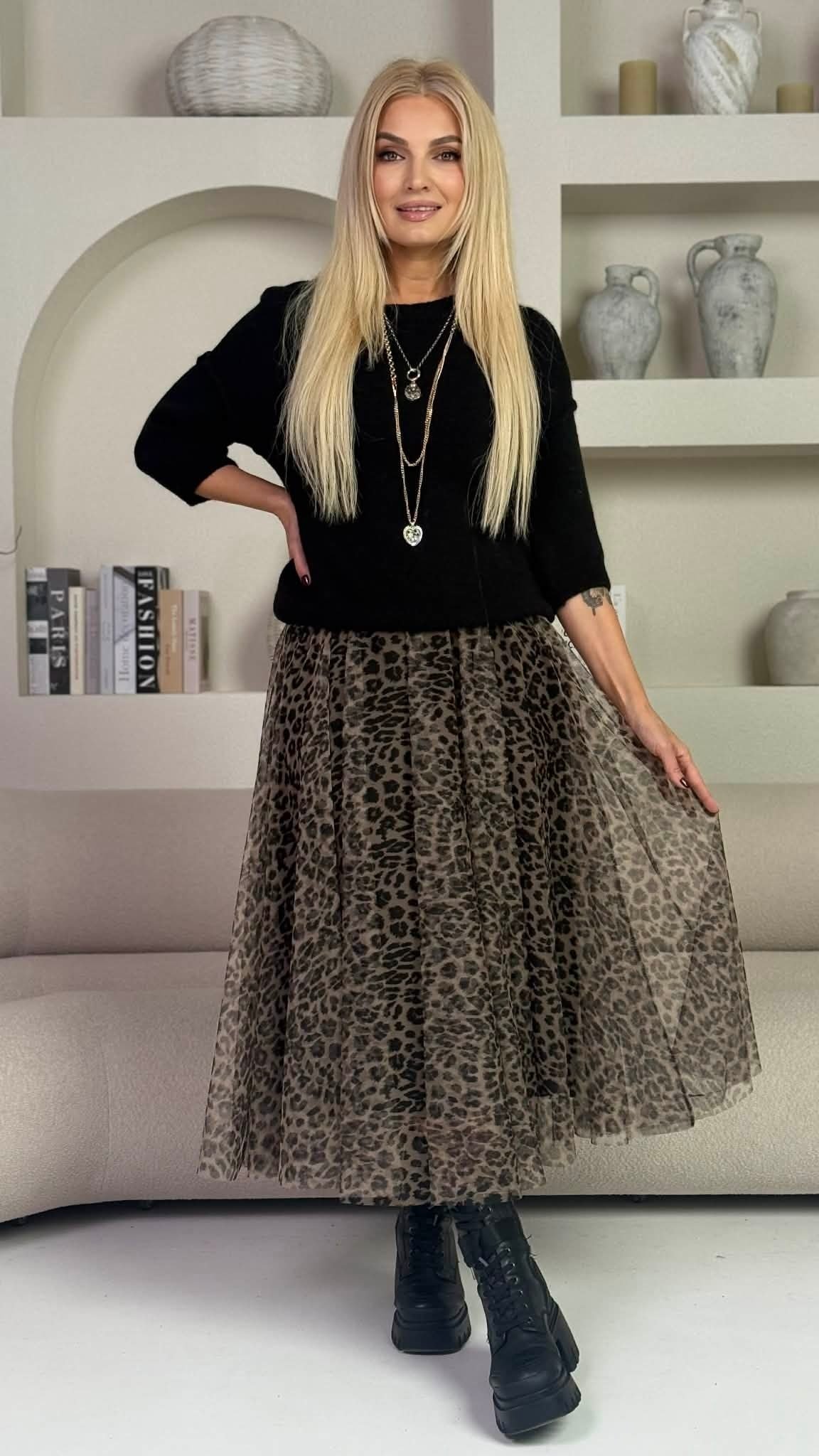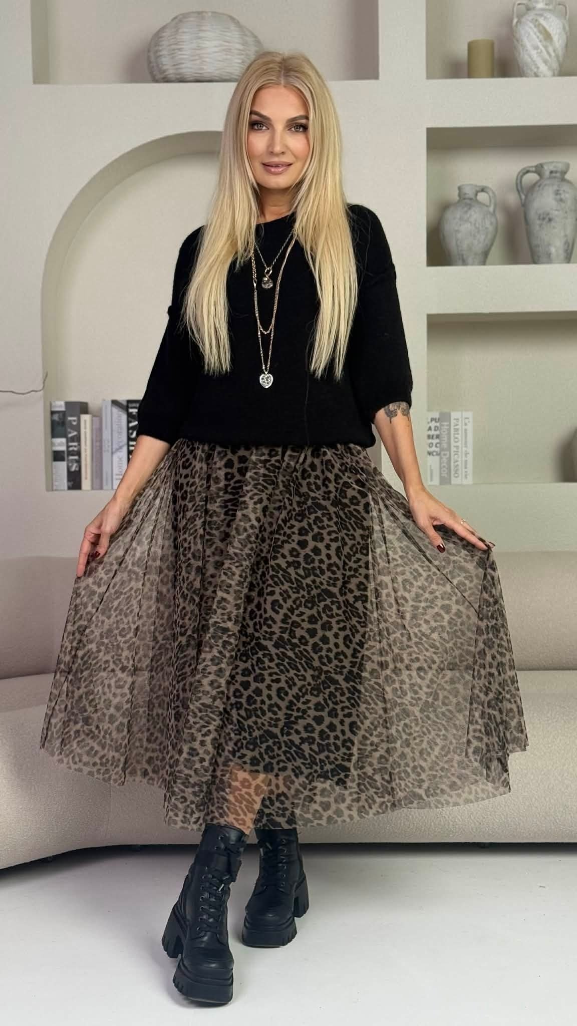 Šis sijonas – tikras moteriškumo akcentas. Puikus pasirinkimas, jei norisi subtiliai išsiskirti ir sužibėti tiek kasdien, tiek ypatingomis progomis. Liemuo su gumele, todėl sijonas puikiai pritaikomas ir komfortiškas. Lengva, plazdanti medžiaga, kuri gražiai ir tolygiai krenta.