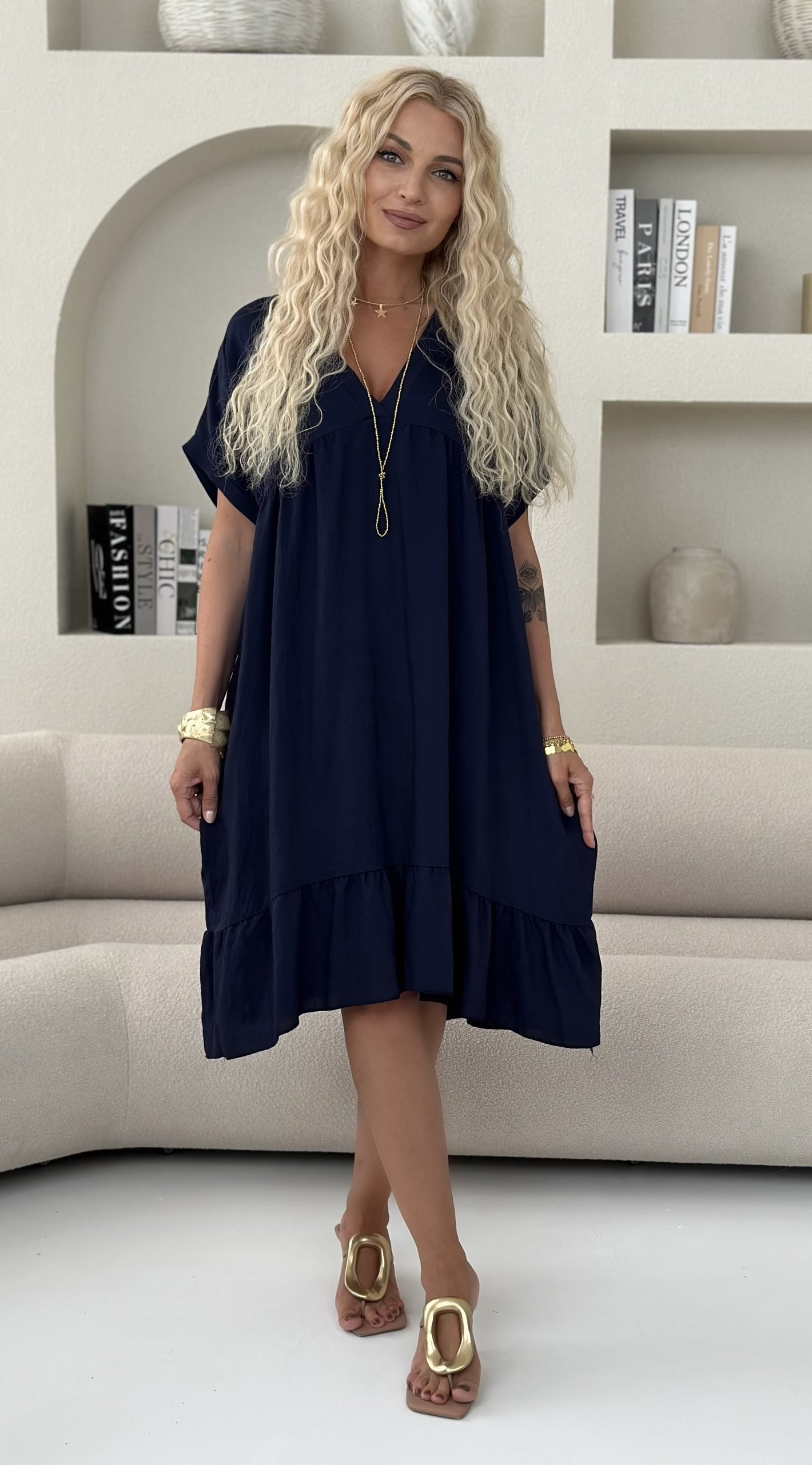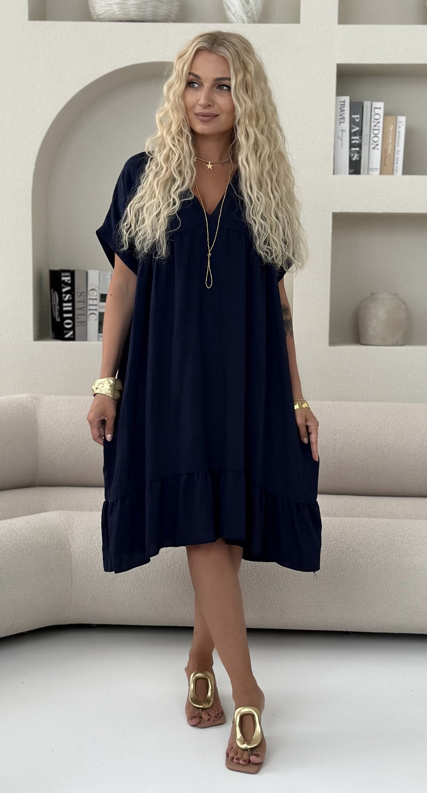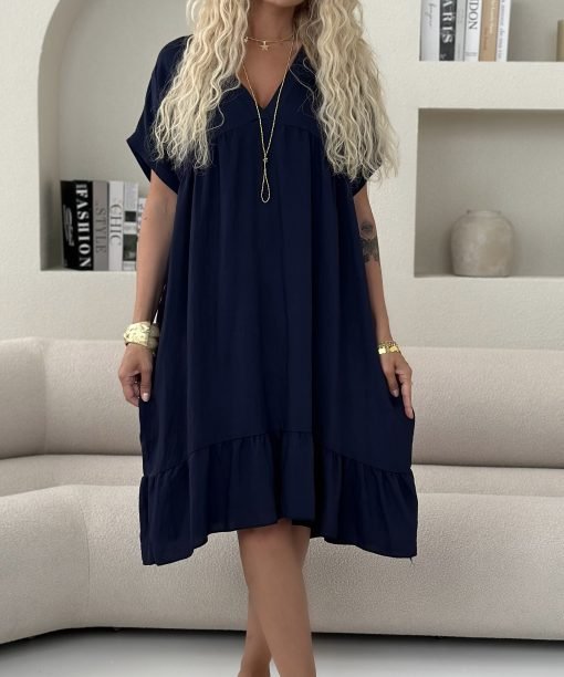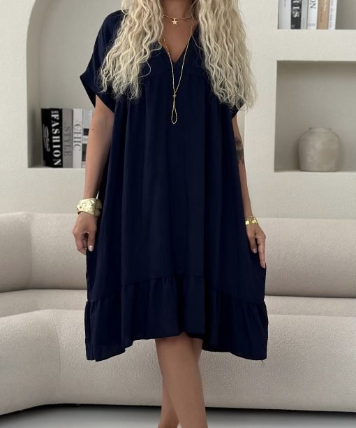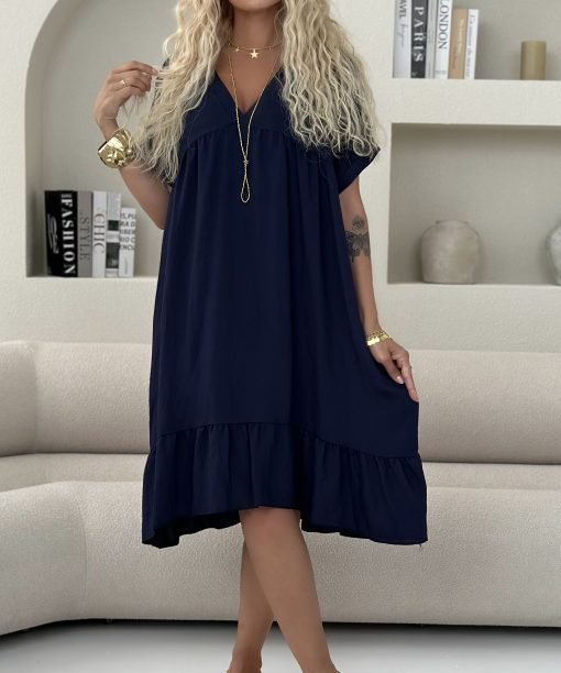Laisvai krentanti suknelė su V formos iškirpte – patogumui, lengvumui ir subtiliam moteriškumui.